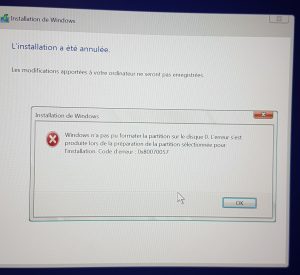Windows n'a pas pu formater la partition sur le disque 0. L'erreur s'est produit lors de la préparation sélectionnée pour l'installation. Code d'erreur : 0x80070057